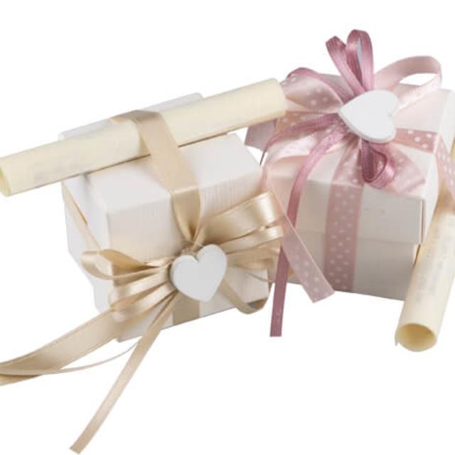 Cuoricino bianco, scatolina quadrata di cartone color panna base per h. 5x 5 cm con nastri raso rosa antico OPPURE con nastri avorio