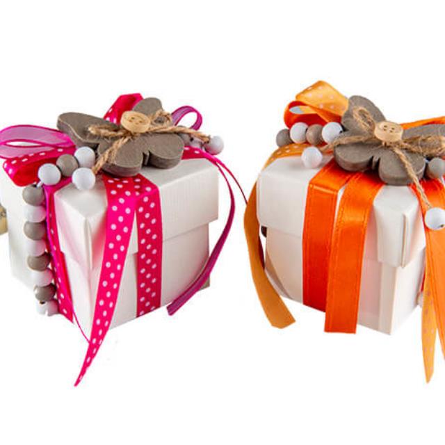 La bomboniera sarà consegnata già montata con 5 confetti bianchi di mandorla e pergamena personalizzabile senza costo aggiuntivo con nome, evento e data.